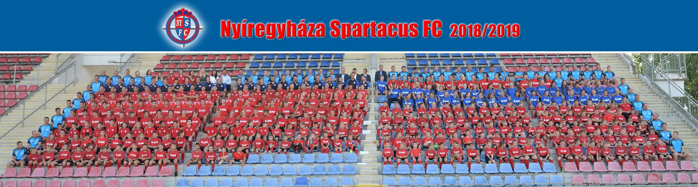 Elkészült a Nyíregyháza Spartacus FC fotója. Felnőtt, utánpótlás, női és férfi játékosok, edzők, vezetők a Városi Stadionban, több mint négyszázan.
