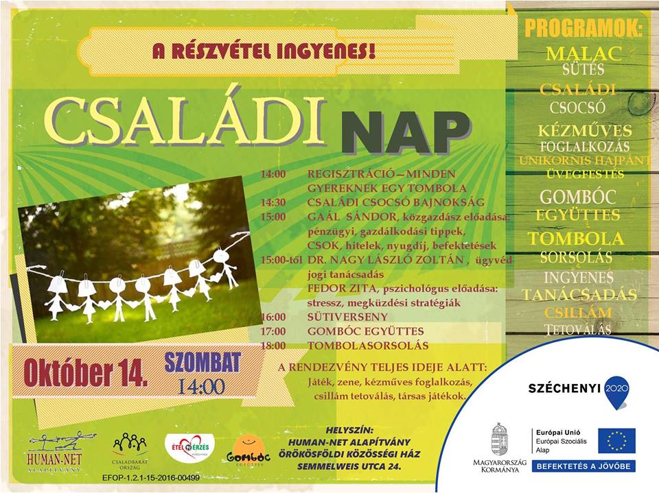 2017. 10. 14-én 14 órától a Human-Net Alapítvány Családi Napot szervez.Színes programok várják a családokat: tanácsadások, családi csocsó bajnokság, sütiverseny, kézműves foglalkozások, csillámtetoválás, társasjátékok, játék, zene egész délután. A nap fénypontja pedig a Gombóc Együttes koncertje, mely után a sütiverseny eredményhirdetésével zárul a program. Önkéntesek jelentkezését is várjuk, akik szívesen bekapcsolódnának a szombat délutáni programok megrendezésébe: díszítés, pakolás, kézműves foglalkozások.