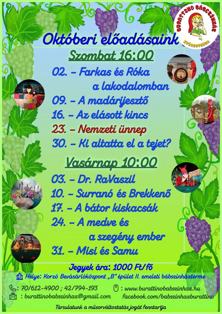A Burattino Bábszínház októberben is várja a családokat előadásaira. Szombat délután és vasárnap délelőtt a Korzó Bevásárlóközpont bábszínház termében kínálnak kellemes kikapcsolódást kicsiknek és nagyoknak egyaránt.