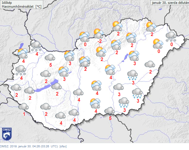A legmagasabb nappali hőmérséklet -2 és +5 fok között valószínű. Késő este 0 és -2 fok közé hűl le a levegő.