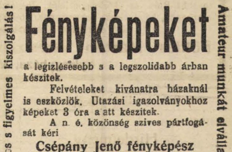 A két világháború közötti nyíregyházi fényképészek közül az egyik legjobban hangzó név Csépány Jenőé volt, aki éppen száz évvel ezelőtt, 1921 januárjában értesítette egy hirdetésben a „nagyérdemű közönséget”, hogy „a Royal szálló felett levő fényképészeti műtermet átvettem, azt modernül, minden igényeknek megfelelően berendeztem”.