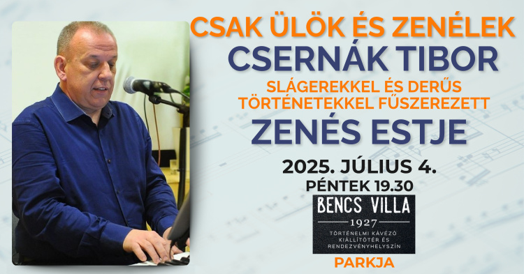 2025. július 4-én, pénteken 19.30 órától Csernák Tibor ad koncertet a Bencs Villa Parkjában, ahol jól ismert zenék és derűs történetek hangzanak majd el. A hangulatos park és a történelmi kávézó igazi hétvégi kikapcsolódást kínál.