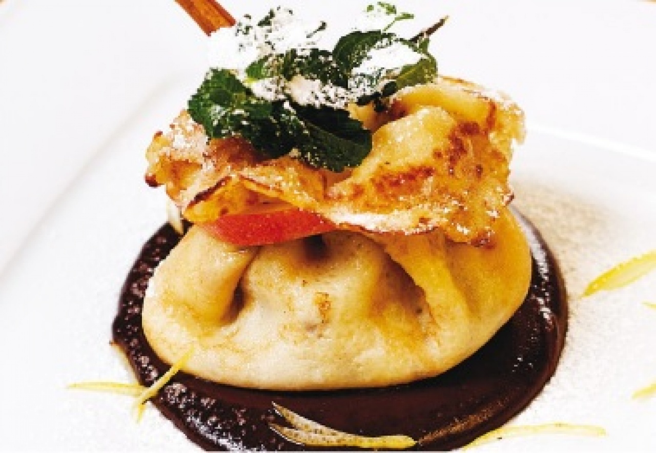 A palacsintákat megtöltjük almatöltelékkel, háromszög alakúra hajtjuk össze és forró csokimártással bevonjuk.