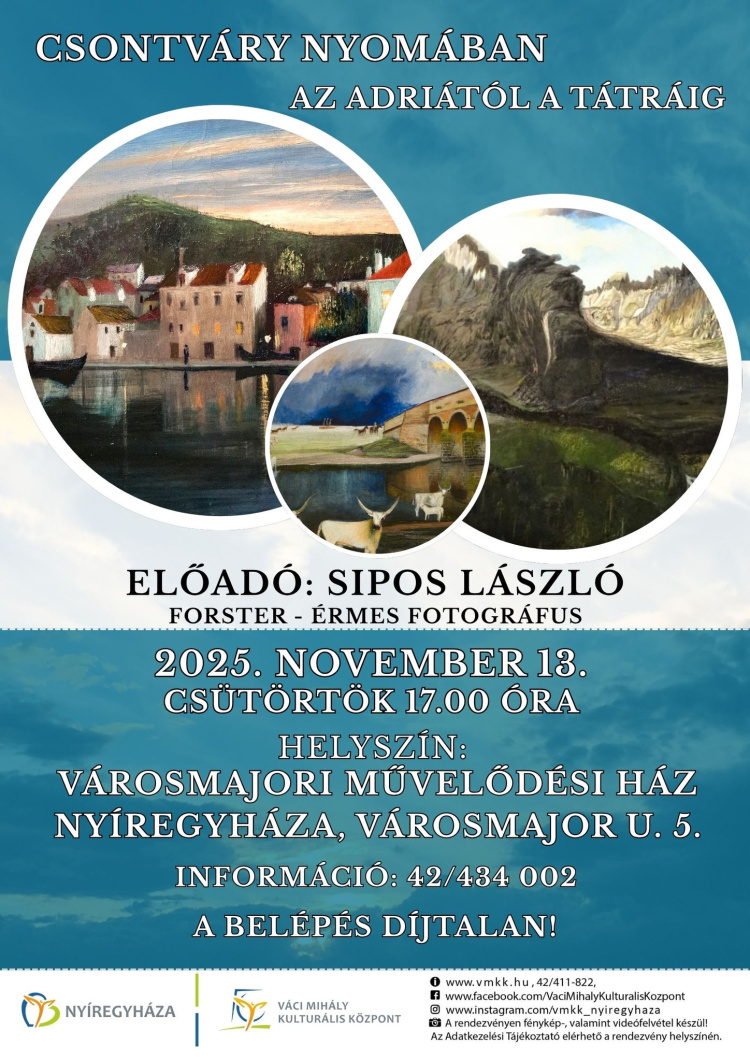 A festészet és a fényképezés különleges találkozásának lehetnek tanúi azok, akik ellátogatnak 2025. november 13-án, csütörtökön 17 órakor a Városmajori Művelődési Házba (Nyíregyháza, Városmajor utca 5.), ahol Sipos László Forster-érmes fotográfus tart vetített képes előadást „Csontváry nyomában – az Adriától a Tátráig” címmel.
