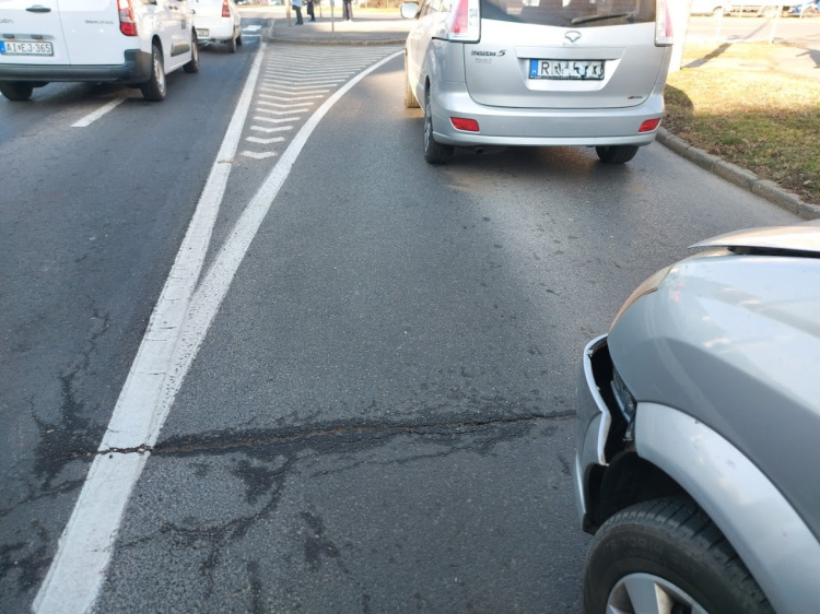 A jobbra kisívben kanyarodó sávban ütközött össze két személygépkocsi. Személyi sérülés nem történt, a felek megegyeztek a felelősség kérdésében.