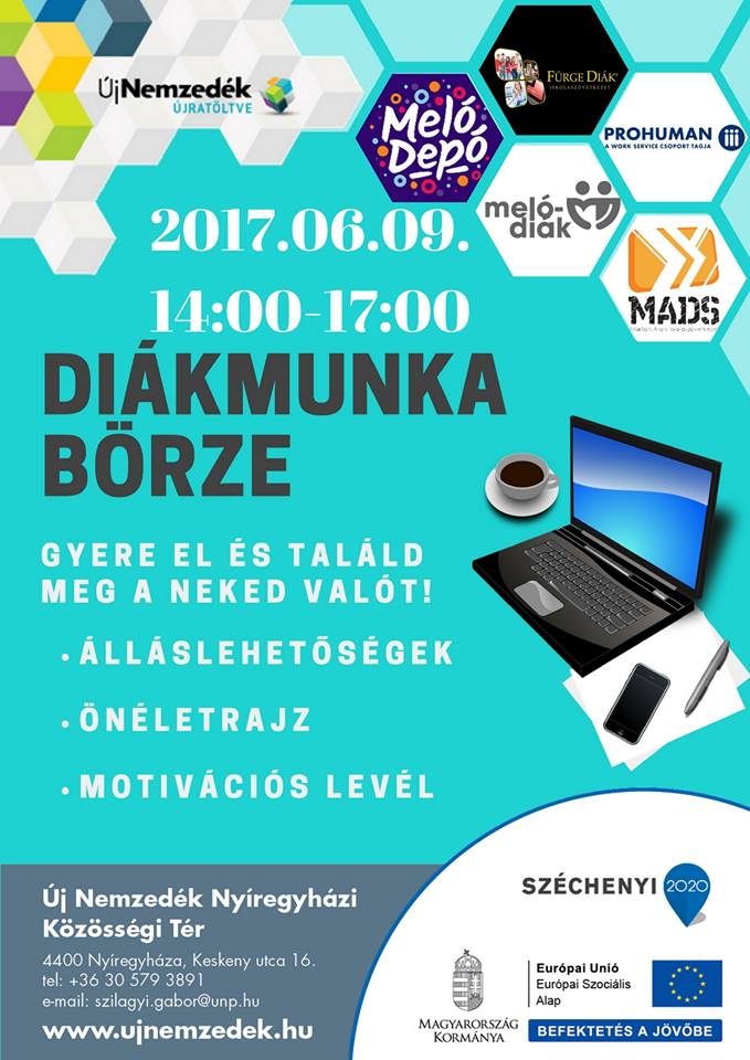 Diákmunka börzét rendeznek az Új Nemzedék Közösségi Térben június 8-án.Vakáció mellett munka? Milyen álláslehetőség kínálkozik a fiatalok számára nyáron? Hogyan kell egy önéletrajzot vagy motivációs levelet megírni? Mindezekre egy helyen kaphatnak most választ a diákok.