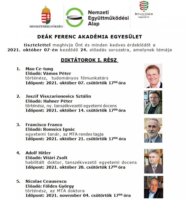 A Deák Ferenc Akadémia Egyesület 24. történelmi előadás-sorozata október 7-e és november 4-e között várja az érdeklődőket a Móricz Zsigmond Megyei és Városi Könyvtár konferenciatermében (Nyíregyháza, Szabadság tér 2. III. emelet). Az öt előadás témája: Diktátorok.