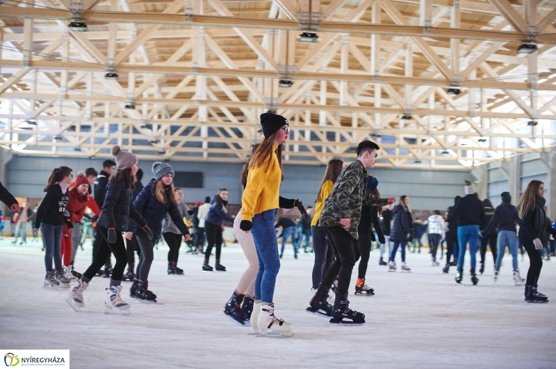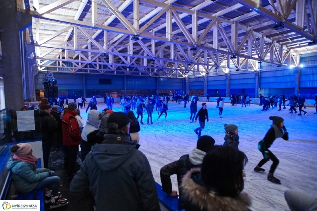 Hóesés fogadta a péntek esti jégdiszkóra érkező fiatalokat Nyíregyházán. A korcsolyák mellett a telefonok is hamar előkerültek, szelfik százai készültek az esti zenés show alkalmával.