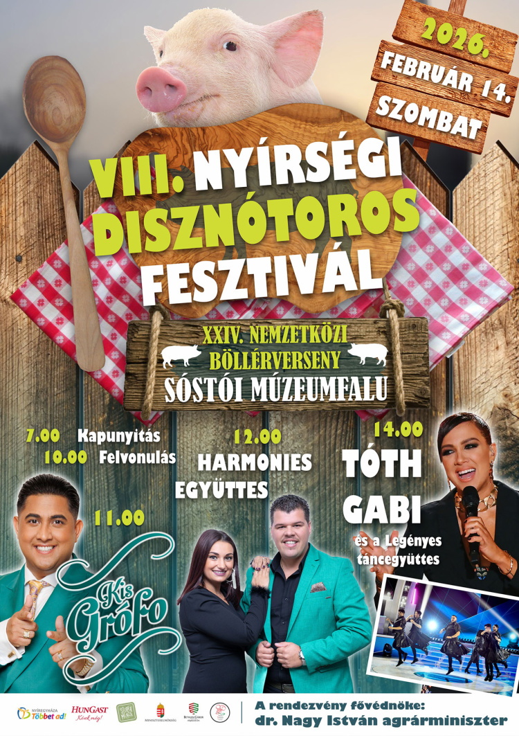 Tizenhat csapat több ezer adag étellel készül a hétvégi disznótoros fesztiválra. Február 14-én, szombaton 7 órakor nyitják ki a Sóstói Múzeumfalu kapuit, hogy elkezdődhessen a 8. Nyírségi Disznótoros Fesztivál és 24. Nemzetközi Böllérverseny. A belépés ingyenes lesz a skanzen területére, az önkormányzat pedig ingyenes buszjárattal is segíti a látogatókat, 6 és 18 óra között három járat is szállítja a vendégeket. A kóstolójegy ára nem változott, egy gasztrojegy 500 forint lesz idén is.
