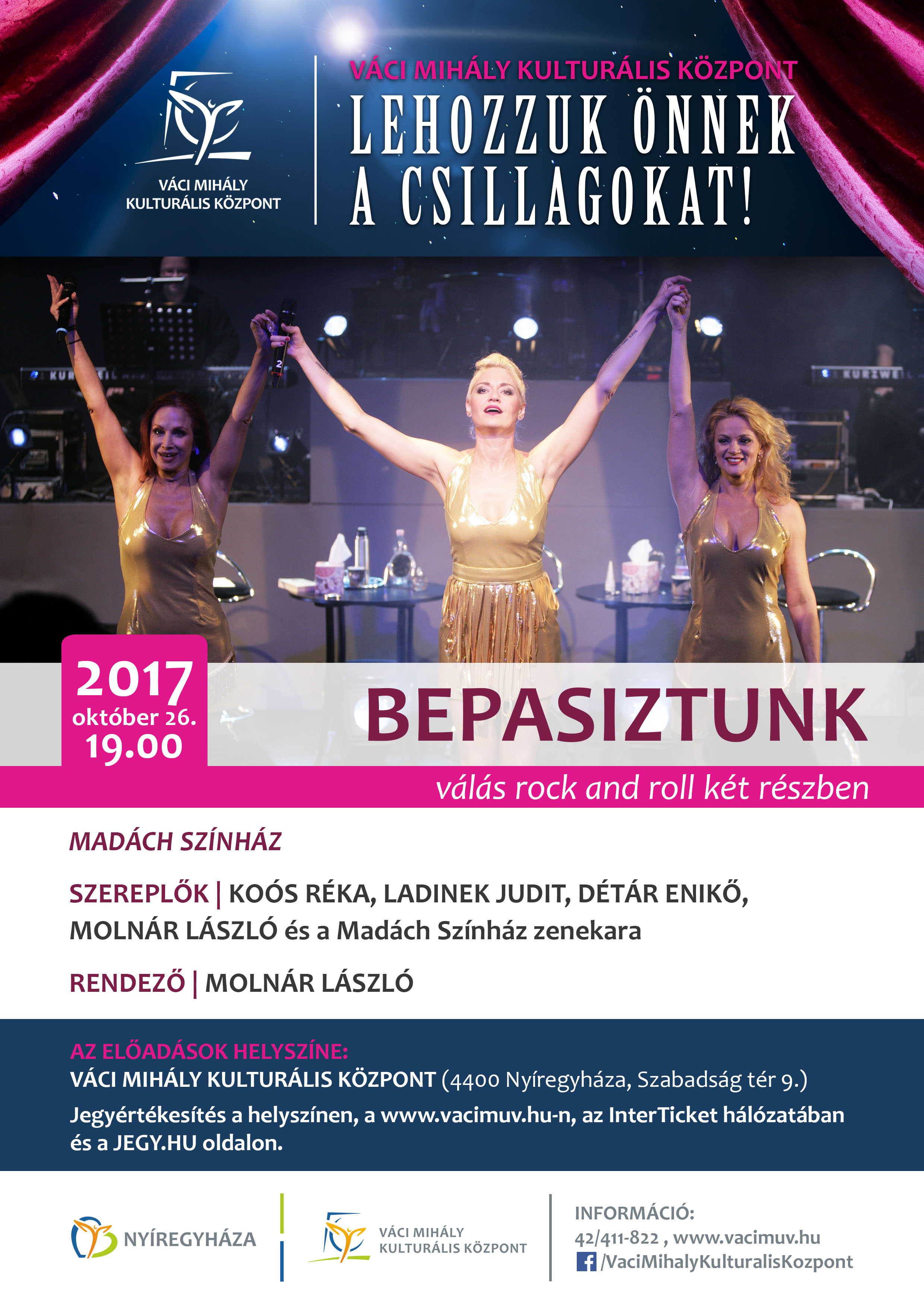A Madách Színház társulatának tagjai és zenekara remek dalokkal, pazar hangokkal viszik színpadra Molnár László rendezésében a „Bepasiztunk” című előadását.