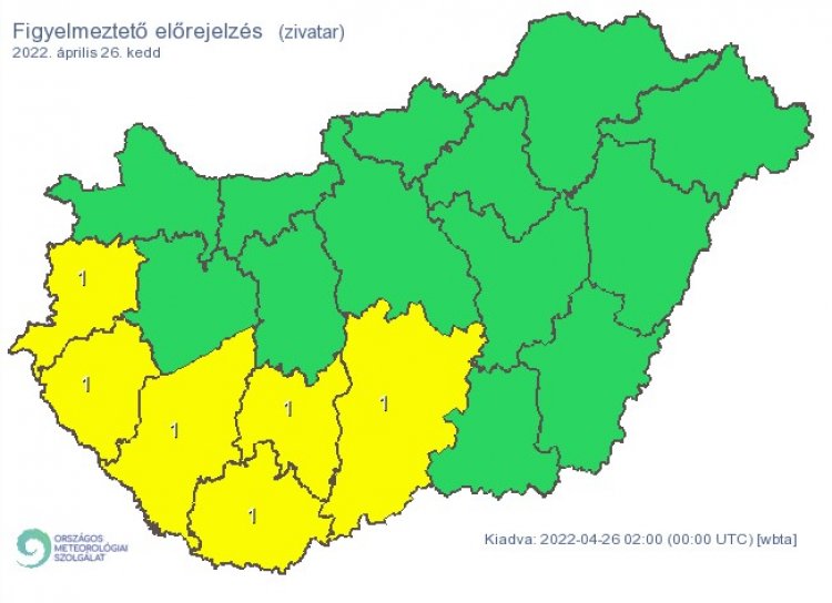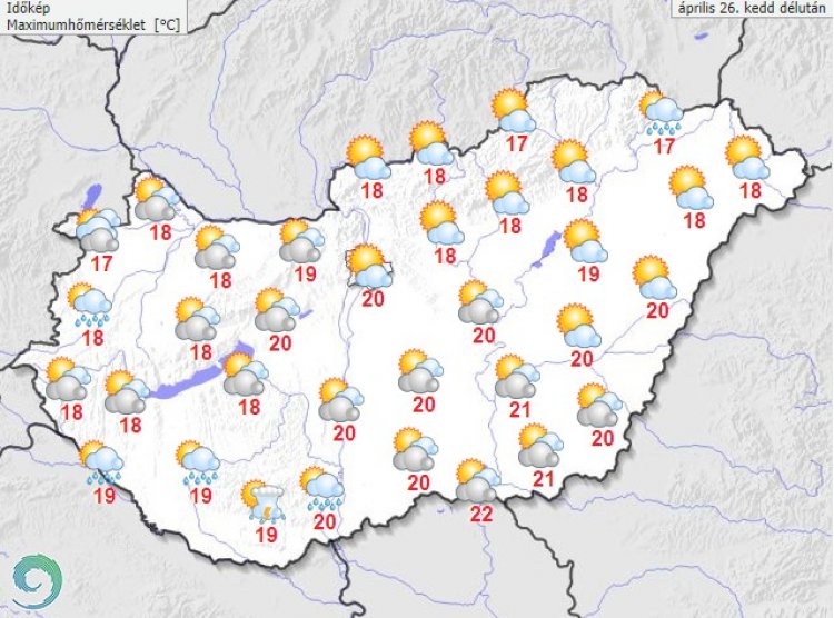 Kedden a legmagasabb nappali hőmérséklet az évszaknak megfelelően alakul. A sok napsütés után késő délutántól, estétől nyugat felől megnövekszik a felhőzet, és egyre több helyen alakulhat ki eső, zápor.