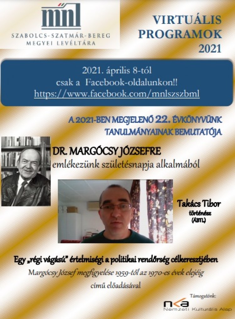 A Szabolcs-Szatmár-Bereg Megyei Levéltár Takács Tibor történész (ÁBTL) különleges történetet megosztó előadásával emlékezik születésének 102. évfordulóján dr. Margócsy József irodalomtörténészre, tanárra, a helyi főiskola főigazgatójára, a levéltár nyugdíjas helytörténeti szaktanácsadójára. Az előadás április 8-tól az intézmény Facebook-oldalán érhető el.