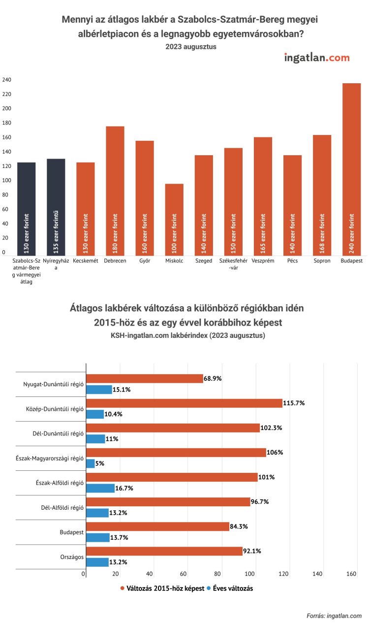 A KSH-ingatlan.com lakbérindexe szerint a Szabolcs-Szatmár-Bereg vármegyét magában foglaló észak-alföldi régióban júliusban 101 százalékkal voltak magasabbak a bérleti díjak, mint 2015-ben. Az országos lakbérindex pedig 92 százalékos drágulást mutatott. Éves összevetésben a régiós lakbérek 17 százalékkal nőttek, szemben az országos 13 százalékos emelkedéssel.