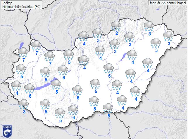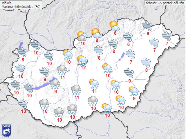 Péntek délelőtt erősen felhős vagy borult lesz az ég, és többfelé várható eső, zápor, majd a déli óráktól észak felől csökkenni kezd a felhőzet, legtovább a Duna vonalában és a Dél-Dunántúlon marad felhős az ég. A nap második felében is itt várható csapadék, és estefelé az eső mellett a Dél-Dunántúlon havas eső is lehet, de havazás sem kizárt. Az északkeleti, északi szél többfelé megerősödik, a középső területek kivételével viharossá fokozódik. A legalacsonyabb éjszakai hőmérséklet 1 és 7 fok között alakul. A legmagasabb nappali hőmérséklet 5 és 12 fok között valószínű, északkeleten késő délelőttől már csökken a hőmérséklet.