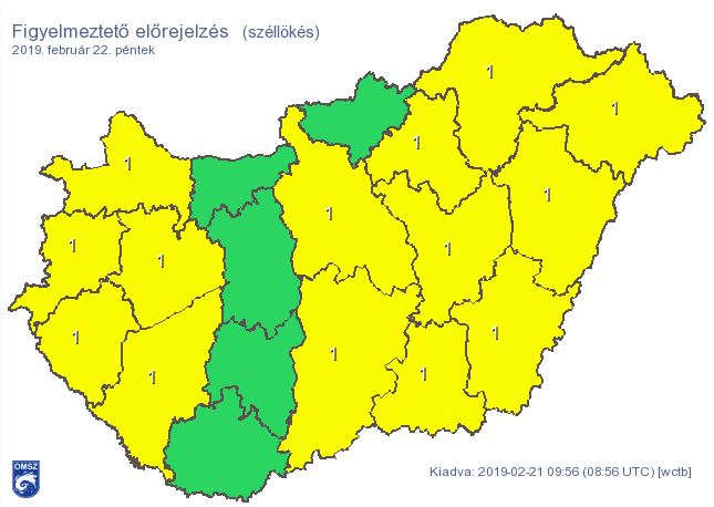 Az Országos Meteorológiai Szolgálat elsőfokú figyelmeztetést adott ki péntekre a legtöbb megyében várható, viharos széllökések miatt.