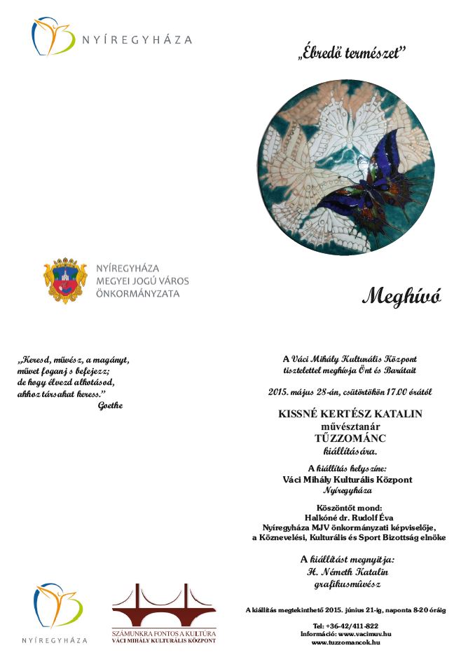 Május 28-án, csütörtökön 17 órától mutatják be Kissné Kertész Katalin tűzzománc kiállítását. Helyszín: a Váci Mihály Kulturális Központ emeleti galériája. A tárlat június 21-éig látogatható.