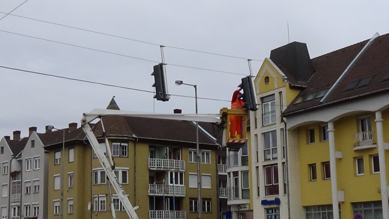 A Magyar Közút munkatársai a város egész területén a közlekedési jelzőlámpák karbantartását végzik emelőkosárból.