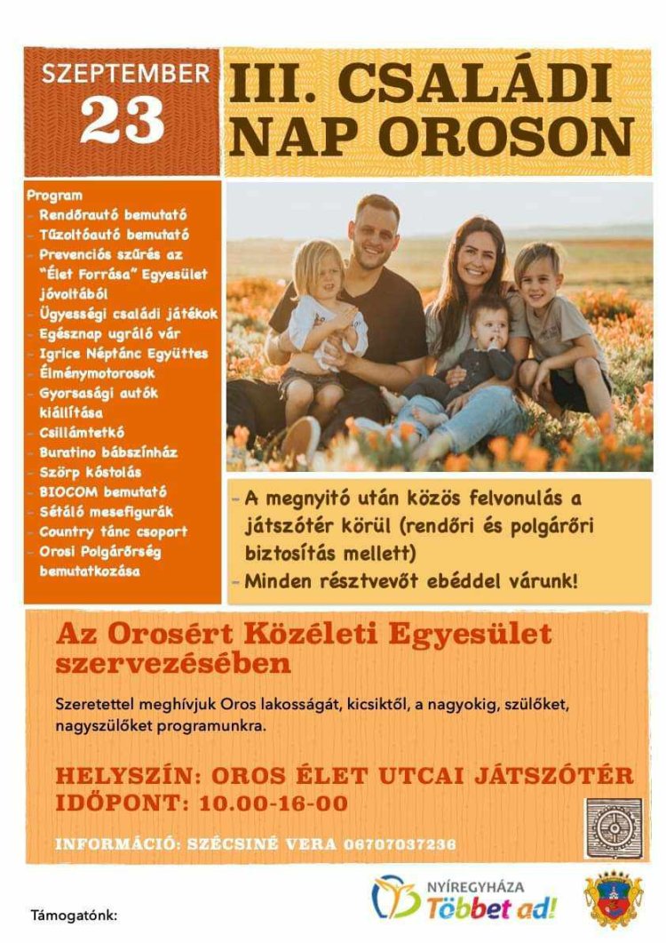 A családi nap felvonulással kezdődik, a helyszíne pedig az orosi Élet utcai játszótér lesz. Amire biztosan számíthatnak a családok; rendőr- és tűzoltóautó bemutató, egészségügyi szűrés, ügyességi játékok, ugrálóvár, néptánc, gyorsasági autók, szörp kóstolás, csillámtetkó, BICOM bemutató, country tánc, polgárőrség bemutatója.