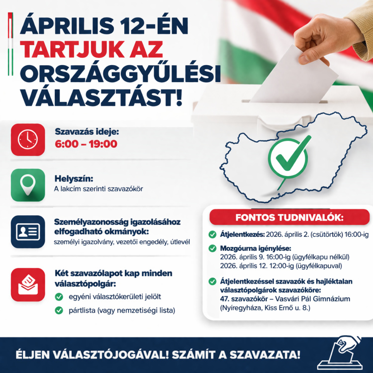 Április 12-én, vasárnap tartják Magyarországon az országgyűlési képviselők általános választását. A voksolás napján reggel 6 órától este 19 óráig adhatják le szavazatukat a választópolgárok. Nyíregyházán is minden szükséges információ rendelkezésre áll annak érdekében, hogy a választás zökkenőmentesen és szabályosan történjen.