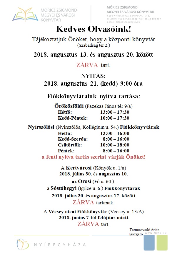 Tájékoztatás a Móricz Zsigmond Megyei és Városi Könyvtár központi könyvtárának egy hetes zárva tartásáról illetve a fiókkönyvtárak nyitva és zárva tartásáról.