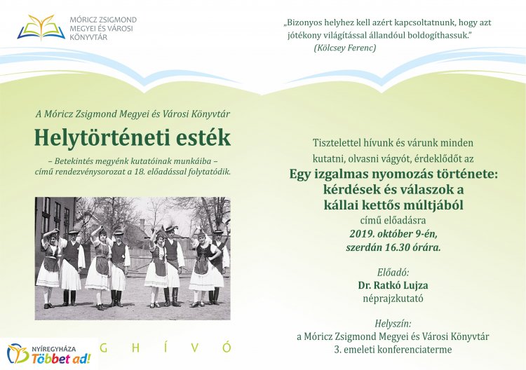 Október 9-én folytatódik a Helytörténeti esték című rendezvénysorozat. Ez alkalommal dr. Ratkó Lujza néprajzkutató tart előadást a kállai kettős múltjáról, a Móricz Zsigmond könyvtárban.