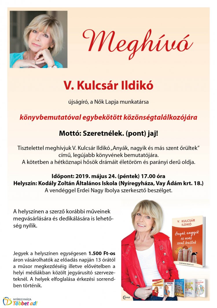 V. Kulcsár Ildikó - a Nők Lapja magazin népszerű újságírója - május 24-én (pénteken) 17.00 órától közönségtalálkozót és könyvbemutatót tart Nyíregyházán.