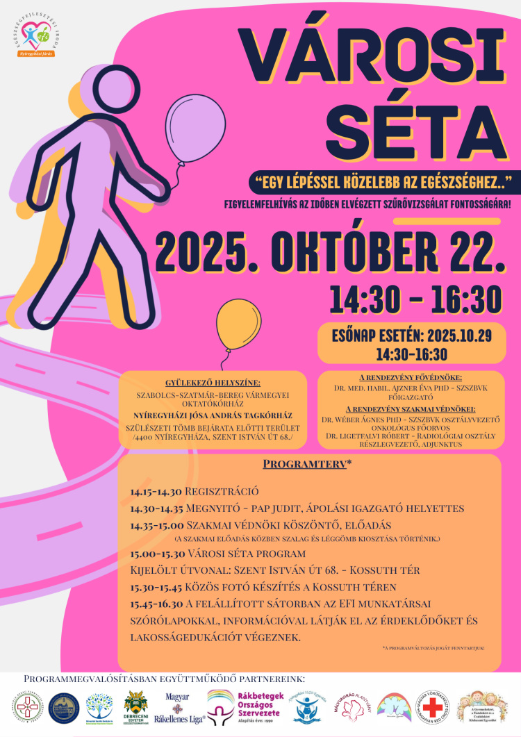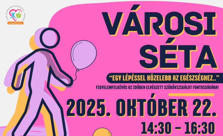 Szeretettel hívják és várják az érdeklődőket a SZSZBVK-Egészségfejlesztési Osztály, Egészségfejlesztési Iroda Nyíregyházi Járás munkatársai által, immár rendhagyó módon, hatodik alkalommal megszervezett „Városi sétára".