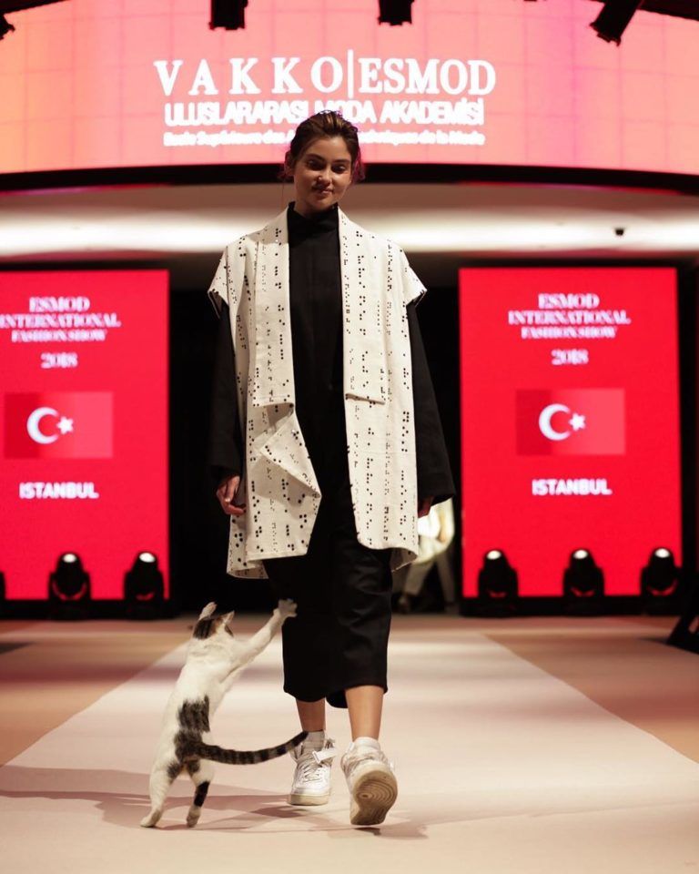 A cica először megtisztogatta magát, majd leheveredett, játszott kicsit a modellekkel, majd pedig maga is végigvonult a kifutón.