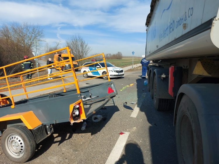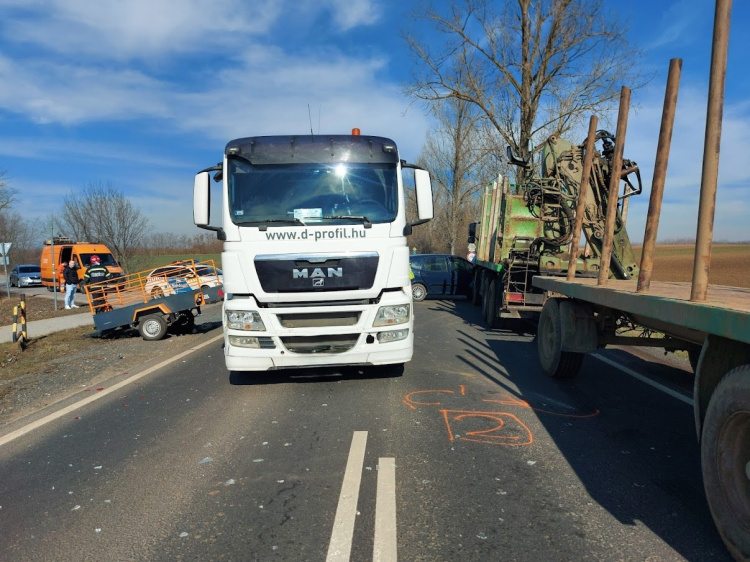 Egy utánfutót húzó személygépkocsi lassított a főúton, a mögötte érkező pótkocsis teherautó sofőrje erre későn reagált és nekiment. A személyautót átlökte a szemközti sávba, ahol egy nyerges vontatónak csapódott. A rendőrség vizsgálja a baleset okát és körülményeit.