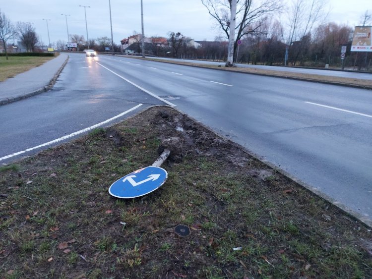 Egy személyautó megcsúszott a László utcán és nekiment az útpadkának, ahol kitört egy kikerülést jelző KRESZ-táblát.