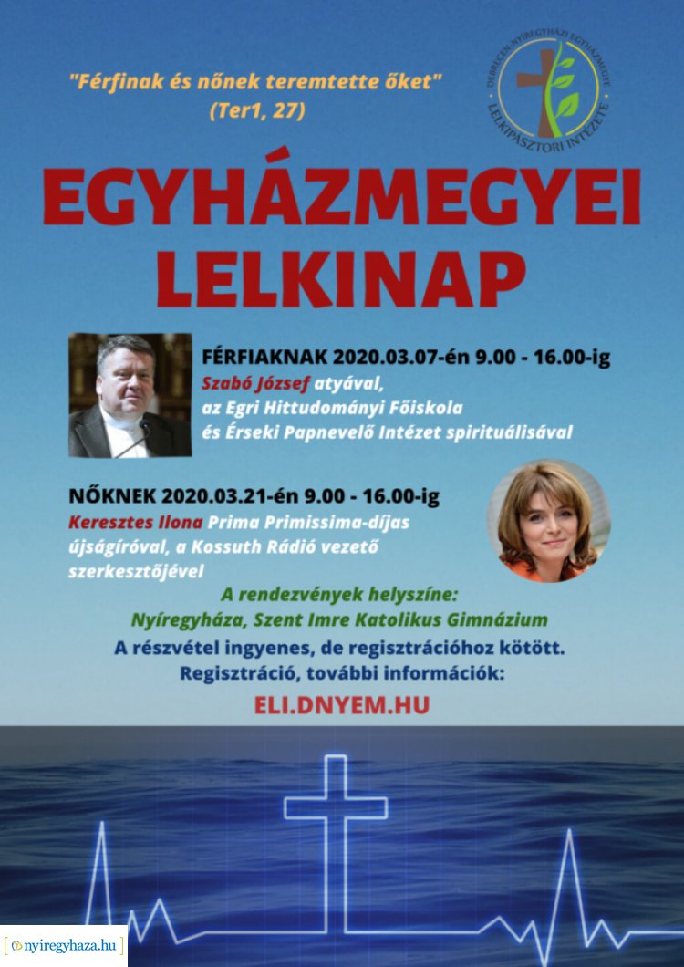 A Debrecen-Nyíregyházi Egyházmegye szervezésében lelki napot tartanak külön férfiaknak és külön nőknek Nyíregyházán, a Szent Imre Katolikus Gimnázium épületében.