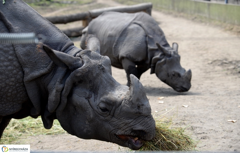 Együtt a kifutóban a rinocéroszpár a Nyíregyházi Állatparkban, a délelőtti csemegét is közösen fogyasztják el. Bár a tízórainál már látszik egy kis nézeteltérés, Hans, a hím nem engedi közel Jázmint az élelemhez, irigy, nem szívesen ad neki a száraz eledelből. Megtörni látszik a napok óta tartó idill.