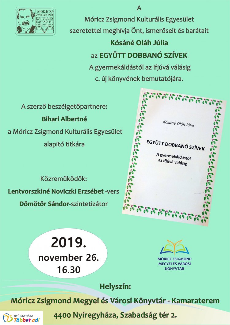 A Móricz Zsigmond Kulturális Egyesület Kósáné Oláh Júlia az Együtt dobbanó szívek - A gyermekáldástól az ifjúvá válásig c. új könyvének bemutatójára várja az érdeklődőket, november 26-án. A szerző beszélgetőpartnere: Bihari Albertné.