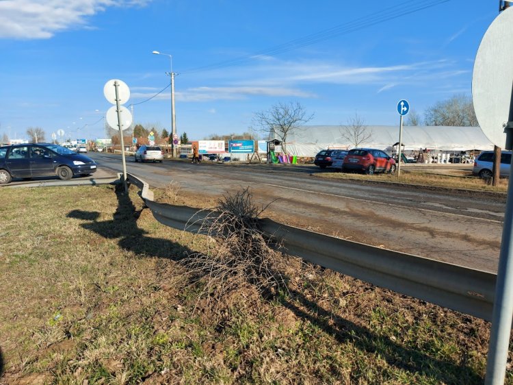 Megrongálta a szalagkorlátot egy ismeretlen jármű a Tokaj úton, a Vásártér előtt a Kopogó utcai csomópontnál.