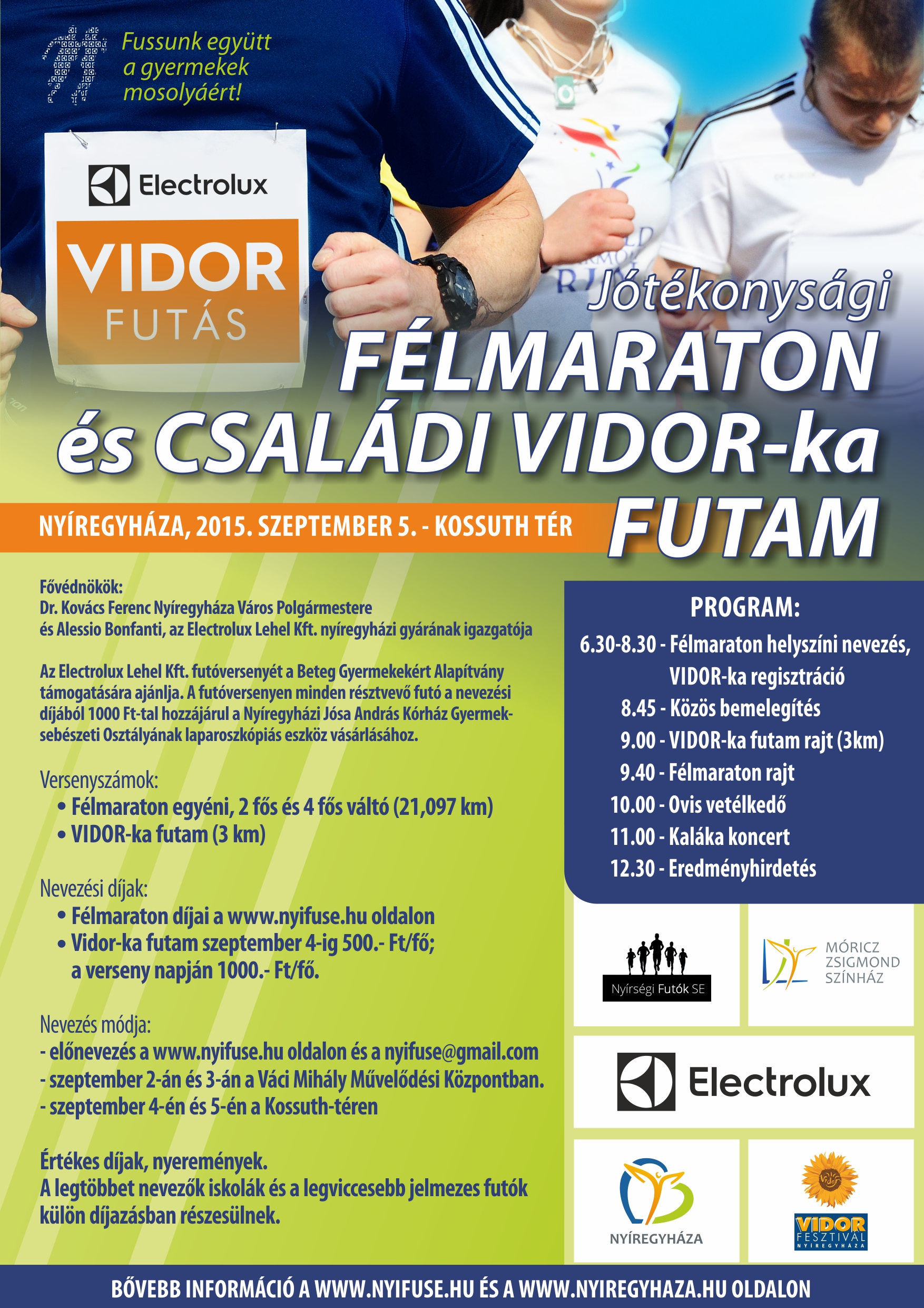 Félmaratoni futóversenyt rendeznek Nyíregyházán. Az Electrolux-VIDOR futás jótékony célt is szolgál, a nevezési díjakból befolyó összeget a Jósa András Oktatókórház Gyermeksebészeti osztályának ajánlják fel. A nap során számos kiegészítő program és koncert is szórakoztatja a résztvevőket.Egy éve ünnepelte a nyíregyházi gyár alapításának tizedik évfordulóját az Electrolux-Lehel Kft. A jubileum alkalmából a cég akkor azzal kedveskedett a város lakóinak, hogy egy sétányt épített és egy futóversenyt szervezett. Idén a VIDOR Fesztivál zárónapján, szeptember 5-én ismét utcai futóversenyt rendeznek, de a táv már 21 kilométer lesz, azaz félmaratont futhatnak a nevezők. Az Electrolux-VIDOR futás jótékony célt szolgál, mivel a nevezési díjból befolyó összeget a Jósa András Oktatókórház Gyermeksebészeti osztályának ajánlják fel, melyből eszközöket vásárolhatnak. A Nyíregyházára települt cégek számára fontos a társadalmi szerepvállalás.