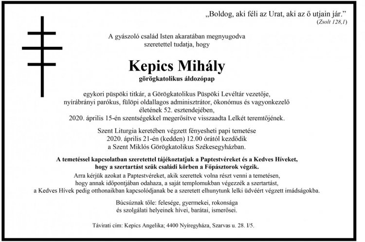 A gyászoló család Isten akaratában megnyugodva szeretettel tudatja, hogy Kepics Mihály görögkatolikus áldozópap, egykori püspöki titkár, a Görögkatolikus Püspöki Levéltár vezetője, nyírábrányi parókus, fülöpi oldallagos adminisztrátor, ökonómus és vagyonkezelő életének 52. esztendejében, 2020. április 15-én szentségekkel megerősítve visszaadta Lelkét teremtőjének.