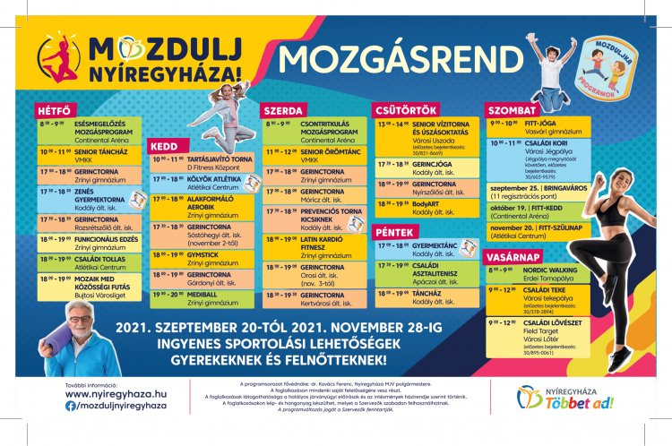 Heti szinten 35 foglalkozás közül tudnak választani a nyíregyháziak, ez több mint 25-féle mozgásformát takar. Külön órákat szerveznek a gyerekeknek, többek között zenés gyermektornára és prevenciós tornára is várják a legkisebbeket. A délelőttök a szépkorúakról szólnak, van senior táncház és csontritkulás mozgásprogram is, de nem feledkeztek el idén sem a családokról, családi asztalitenisz, teke és lövészet közül válogathatnak, a későbbiekben pedig családi korira is várják őket a Városi Jégpályán.