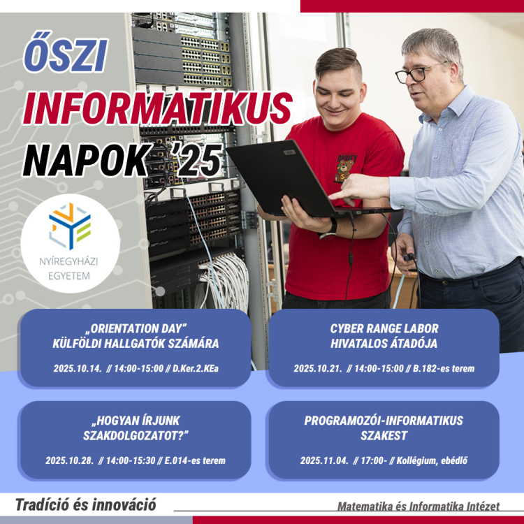 A Nyíregyházi Egyetem Matematika és Informatika Intézete idén először rendezi meg az Őszi Informatikus Napokat, amely október és november folyamán szakmai és közösségi eseményekkel várja az informatikus hallgatókat, oktatókat és partnereket.