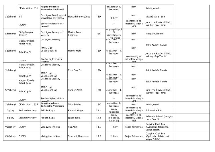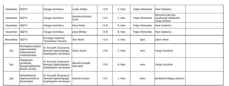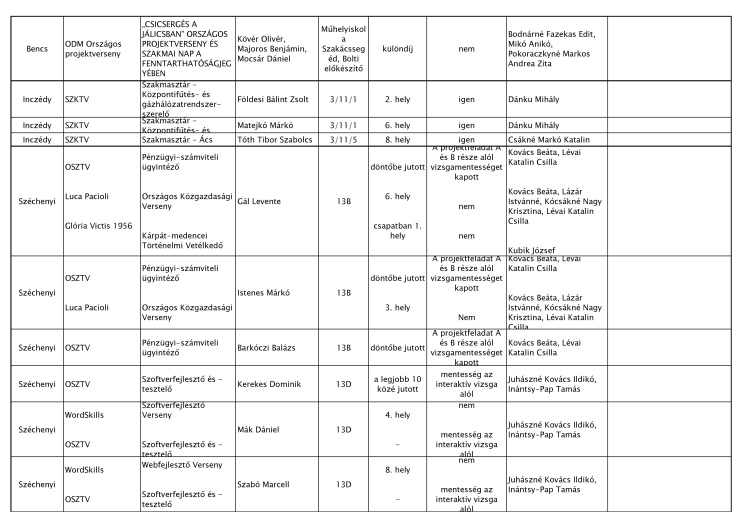 Idén 42 tanuló részesül díjazásban, akik hazai és nemzetközi szakmai versenyeken, az Országos Szakmai Tanulmányi Versenyen (OSZTV), a Szakma Kiváló Tanulója Versenyen (SZKTV) első tíz helyezettje között szerepeltek. Büszkék vagyunk tanulóink országos szakmai, kulturális és sport versenyeken elért eredményeikre.