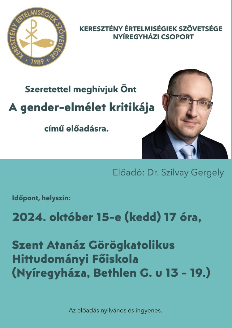 Október 15-én (kedden), 17.00-tól dr. Szilvay Gergely tart előadást korunk egyik aktuális kérdéséről a „gender-elméletről” a Szent Atanáz Hittudományi Főiskolán. Az előadót a Keresztény Értelmiségiek Szövetsége Nyíregyházi Csoportja hívta meg a megyeszékhelyre.