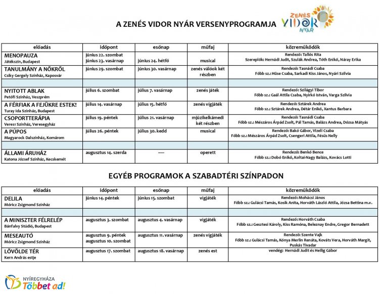 „A Nyíregyházáról elszármazott Mészáros Árpád Zsolt már rendszeres, visszatérő vendégünk, a nézők szinte el is várják, hogy évről évre meghívjuk a népszerű színészt rendezvényeinkre. Idén két előadással is igyekszünk a kedvükben járni: július 19-én Galambos Attila-Szente Vajk: Csoportterápia című „mjúzikelkámedijében” (Veres1 Színház, rendező: Tasnádi Csaba), melyben Pál Tamás, Balázs Andrea, Dózsa Mátyás lesznek MÁZS partnerei, július 26-án pedig A púpos musicelben (komáromi Magyarock Dalszínház, rendező: Bakó Gábor, Vizeli Csaba) Fésüs Nellyvel és Csengeri Attilával láthatják viszont nézőink kedvencüket. A Kecskeméti Katona József Színház igazi klasszikussal érkezik az immár zenés darabokat is felvonultató seregszemlére: Eisemann Mihály, Somogyi Gyula és Zágon István: Állami áruháza Benkó Bence rendezésében augusztus 14-én varázsolja majd el az operettkedvelő közönséget” – tette hozzá a teátrum vezetője.