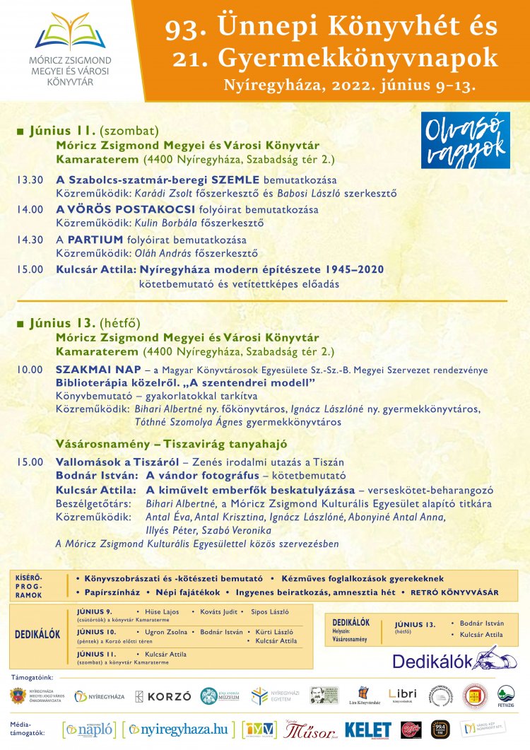 A programok természetesen ma is folytatódnak. Fél kettőtől a hagyományok szerint folyóirat-bemutató lesz. A Szabolcs-szatmár-beregi Szemle, a Vörös Postakocsi és a Partium szerkesztői lépnek a közönség elé, délután három órától pedig Kulcsár Attila kötetbemutatója és vetítettképes előadása következik Nyíregyháza modern építészete 1945-2020 címmel.