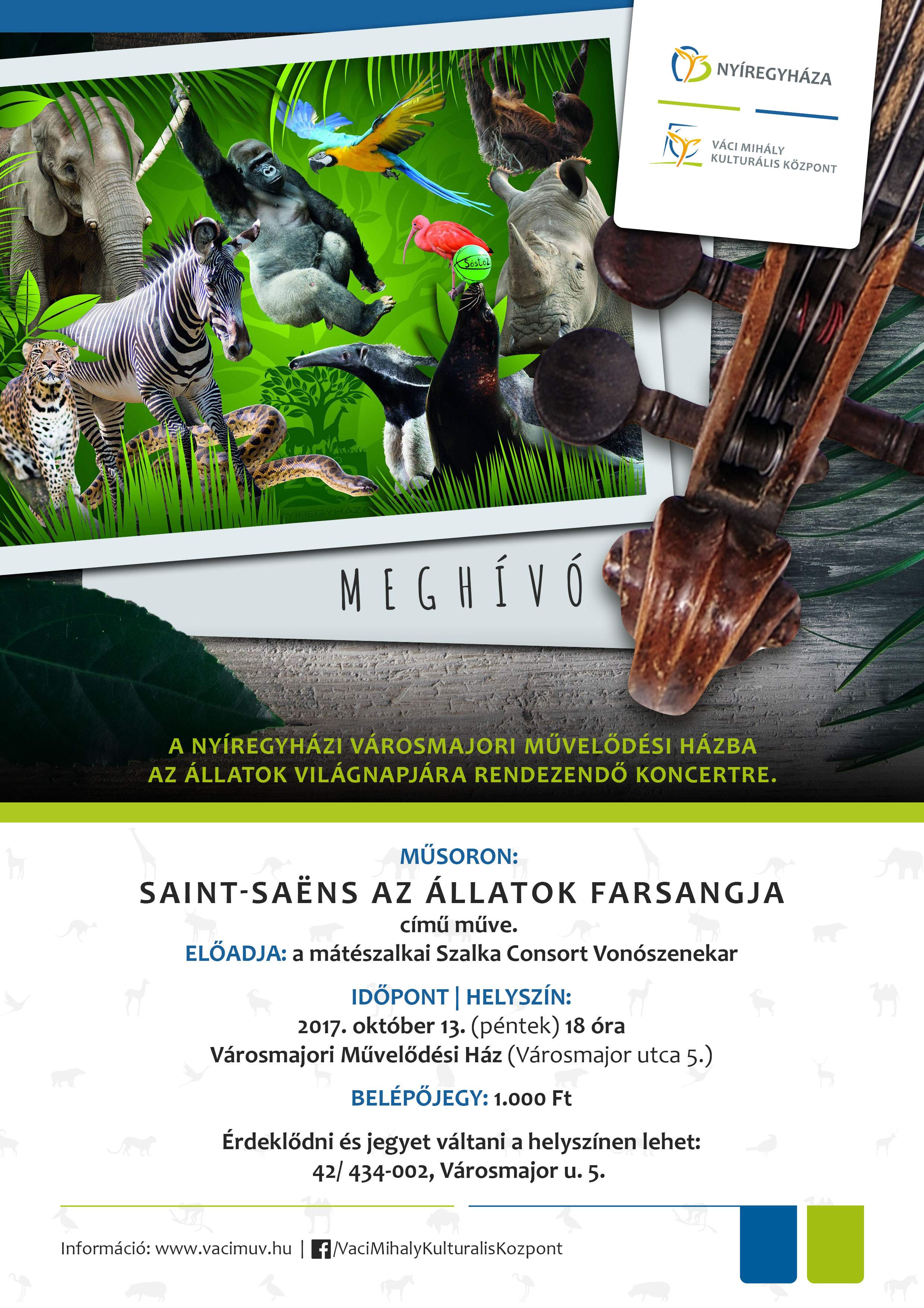 Rettenetes oroszlánüvöltés és elefántdübörgés zaja veri majd fel a Városmajori Művelődési Házat 13-án, pénteken este.A félelmetes fenevadakat és kisebb állatokat (vadszamarak, madarak, teknőcök) a mátészalkai Szalka Consort együttes "idomárai bocsátják majd szabadon" Saint-Saens útmutatásai alapján. Aki kedveli a komolytalan komolyzenét, az állatokat és a humort, 18 óra előtt (de a belépőjegy megváltása után) foglalja el helyét a nézőtéren, ahol biztonságban élvezheti majd Az állatok farsangját!