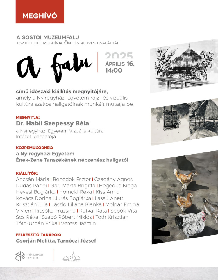 A falu” elnevezésű tárlatot 14 órakor dr. Habil Szepessy Béla, a Nyíregyházi Egyetem Vizuális Kultúra Intézet igazgatója nyitja meg, közreműködnek a Nyíregyházi Egyetem Ének-zene Tanszékének népzenész hallgatói.