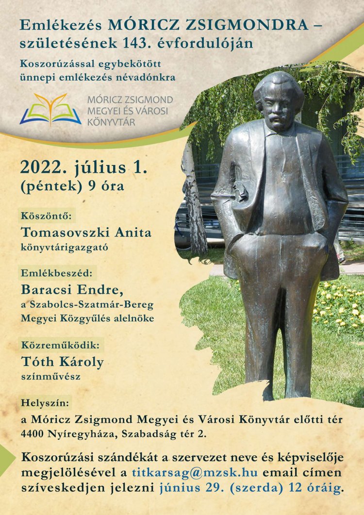 Koszorúzással egybekötött ünnepi megemlékezést rendez a Móricz Zsigmond Megyei és Városi Könyvtár július elsején.