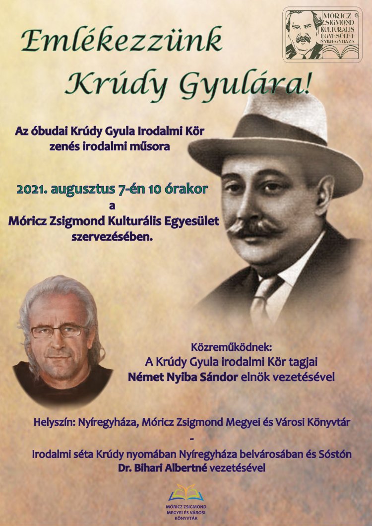 Az óbudai Krúdy Gyula Irodalmi Kör közel 40 tagja augusztus 7-én Nyíregyházára látogat, a Móricz Zsigmond Kulturális Egyesület vendégeként. A Kör tagjai 10 órától zenés irodalmi műsorral várják az érdeklődőket a Móricz Zsigmond Megyei és Városi Könyvtárban. Az összejövetel résztvevői 14 órától irodalmi sétát tesznek Krúdy nyomában, Nyíregyháza belvárosában és Sóstón.