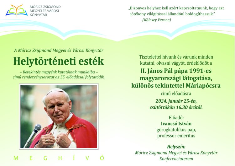 Tisztelettel hívnak és várnak minden kutatni, olvasni vágyót, érdeklődőt a II. János Pál pápa 1991-es magyarországi látogatása, különös tekintettel Máriapócs című előadásra.