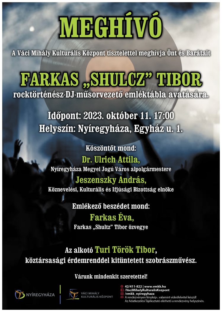 A Váci Mihály Kulturális Központ tisztelettel meghívja Önt és Barátait Farkas "Shulcz" Tibor rocktörténész, DJ, műsorvezető emléktábla avatására.