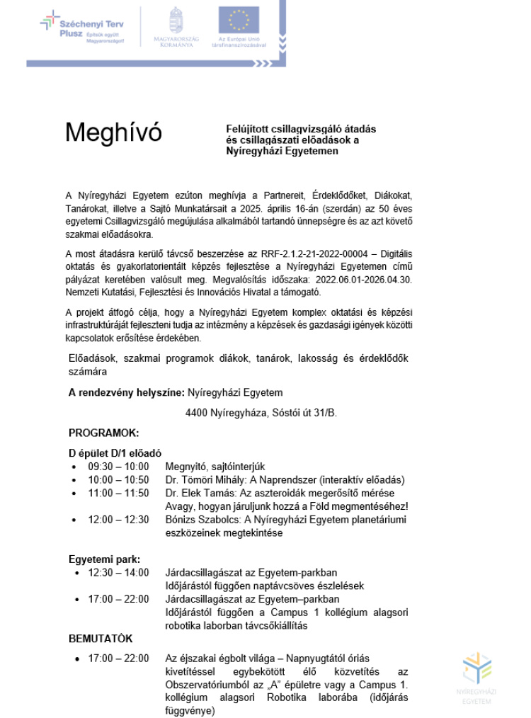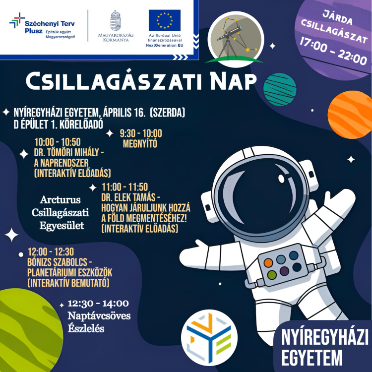 Naptávcsöves észlelés, interakítv elődás, planetáriumi eszközök - április 16-án 09.30-től a csillagászat világával ismerkedhetünk meg a a Nyíregyházi Egytemen!