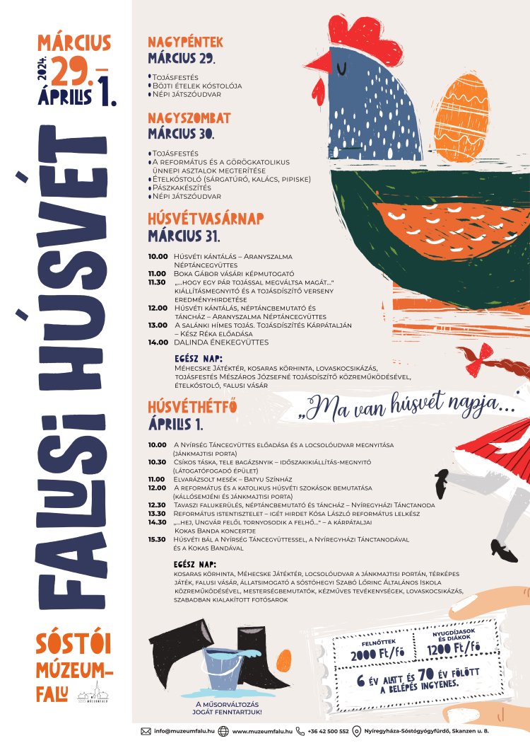 A faluközpontban 11.00 órakor a Batyu Színház „Elvarázsolt mesékkel” várja a családokat. Az érdeklődők a református és görögkatolikus húsvéti szokásokkal is megismerkedhetnek, valamint 14.00 órakor a templomban református istentiszteleten vehetnek részt. A Tánctanoda lelkes táncosai tavaszi falukerülésre hívják a Múzeumfalu látogatóit, melynek helyszíne a faluközpont. 14.30-kor a kárpátaljai Kokas Banda koncertje kezdődik, a nap végén pedig egy hamisítatlan Húsvéti Bál hangulatát idézzük meg.